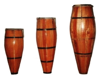 Instrumentos sagrados nas religiões de matrizes africanas, os atabaques possuem tamanhos variados e funções específicas no contexto das curimbas. Da esquerda para a direita: Lê (tambor menor e mais agudo); o Rumpi (tamanho médio) e o Rum (o maior de som grave).